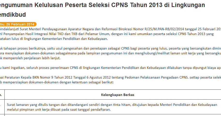 Informasi ini didapatkan dan diperoleh dari website resmi Kementrian Pendayagunaan Aparatur Negara dan Reformasi yaitu www.menpan.go.id update pada hari Rabu 14 Mei 2014 ini. Pengumuman hasil tes cpns honorer K2 untuk Kementrian Agama dan Kementrian Pendidikan dan Kebudayaan akan dirilis ole panselnas dan juga akan ditayangkan dan. Polemik-tenaga-honorer-12-tenaga-honorer-k2-mundur 2014-05-30T20:59:58+07:00.